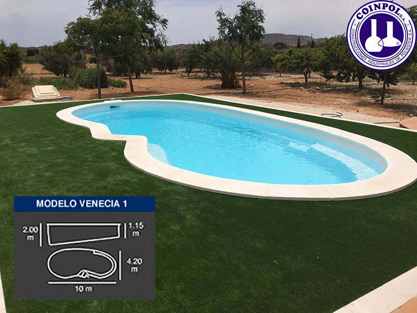 El modelo Venecia 1 es uno de los modelos estrella en las piscinas de estilo riñón y la de mayor tamaño de las Venecia. Disfrute de una piscina de grandes dimensiones con unas escaleras muy elegantes.